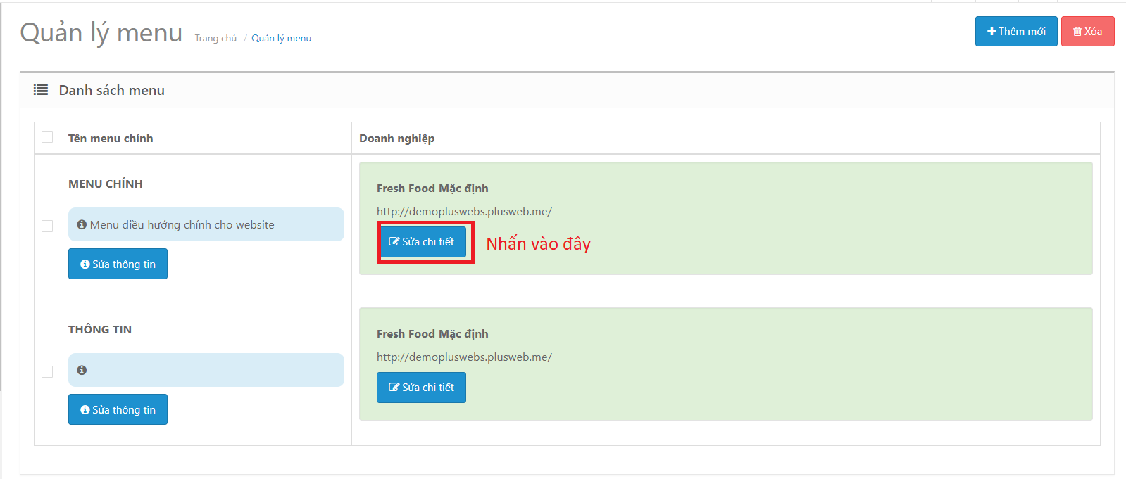 Bước 2: Trong giao diện Menu nhấn sửa chi tiết của menu chính