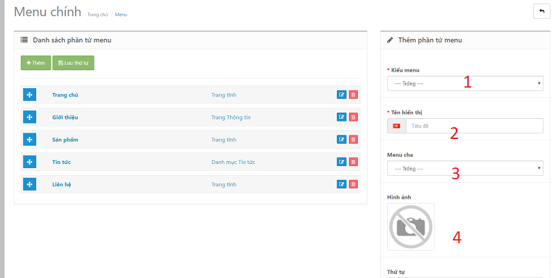 Bước 3: Tại giao diện Sửa menu, bạn có thể Thêm, Sửa, Xóa , thay đổi vị trí 1 phẩn tử menu.